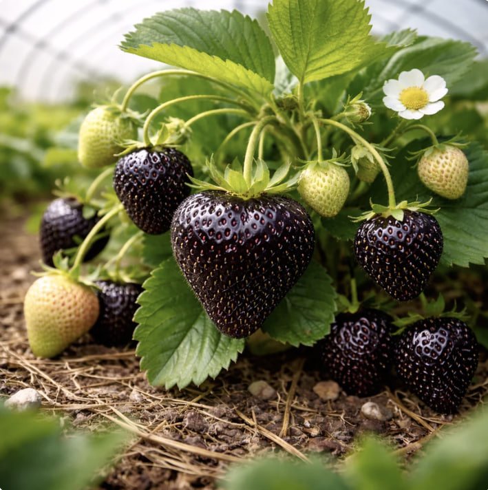 Зустрічайте полуницю, яка перетворює кожен сад на видовищне шоу. Ці рідкісні чорні полуниці дозрівають до глибокого, блискучого фіолетово-чорного кольору і виростають до вражаючого розміру долоні. Соковиті, надзвичайно солодкі та насичені багатим ягідним смаком, вони виглядають так само неймовірно, як і смакують. Ідеальні для свіжих перекусів, десертів та привабливих фотографій саду, це не звичайні полуниці.