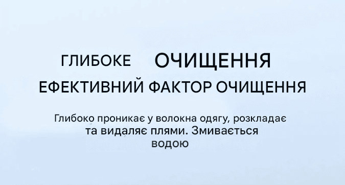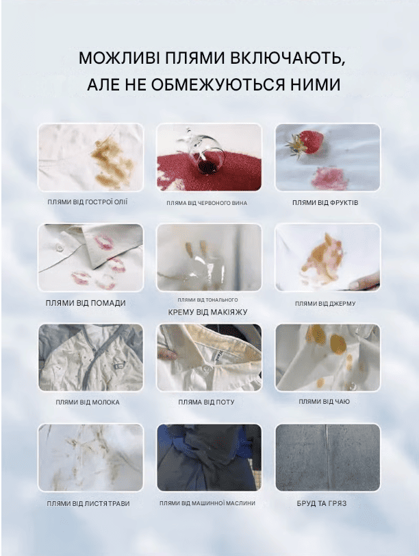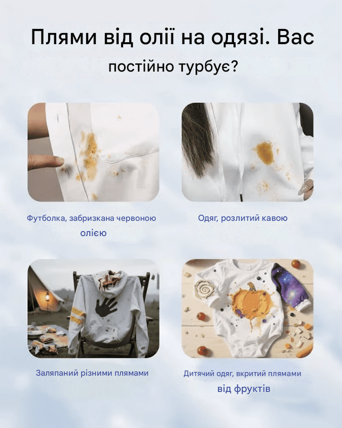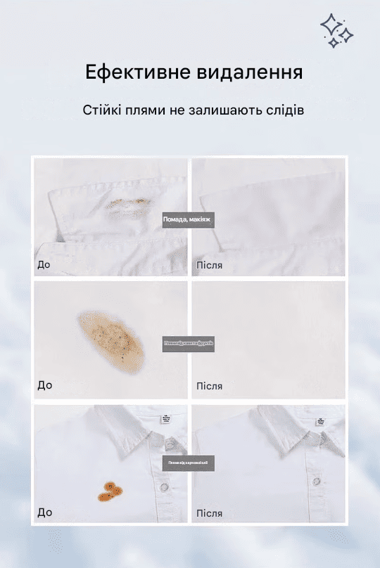 Легко видаляє: пожовклі комірці, сліди поту, масляні плями, плями від макіяжу, розливи вина, краплі їжі та щоденний бруд.