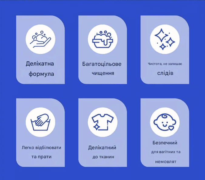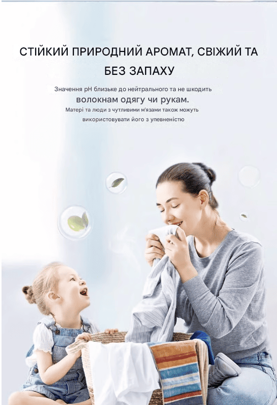 Без відбілювача, без агресивних хімікатів. Ретельно очищає , не вицвітаючи, не сідаючи та не пошкоджуючи волокна , зберігаючи ваш одяг м’яким та довговічним після кожного прання.